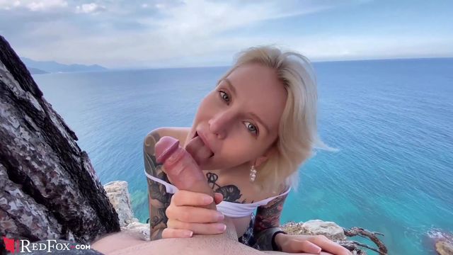 Блондинка в татуировках сосет парню на берегу с видом на океан